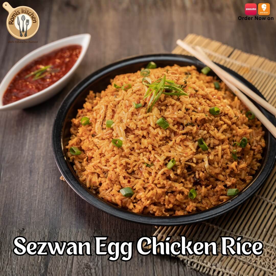 Indulge in the bold flavours of our Schezwan Egg Chicken Rice – the ultimate spicy feast!